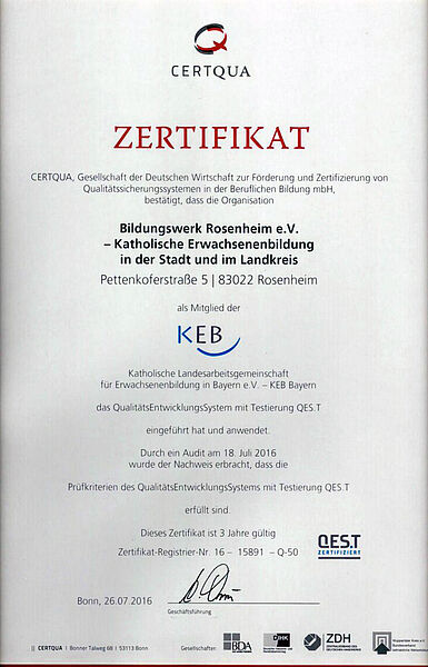 Das Bildungswerk Rosenheim ist als Mitglied der Katholischen Landesarbeitsgemeinschaft für Erwachsenenbildung in Bayern e.V. (KEB Bayern) in das QualitätsEntwicklungsSystem (QES) eingebunden.